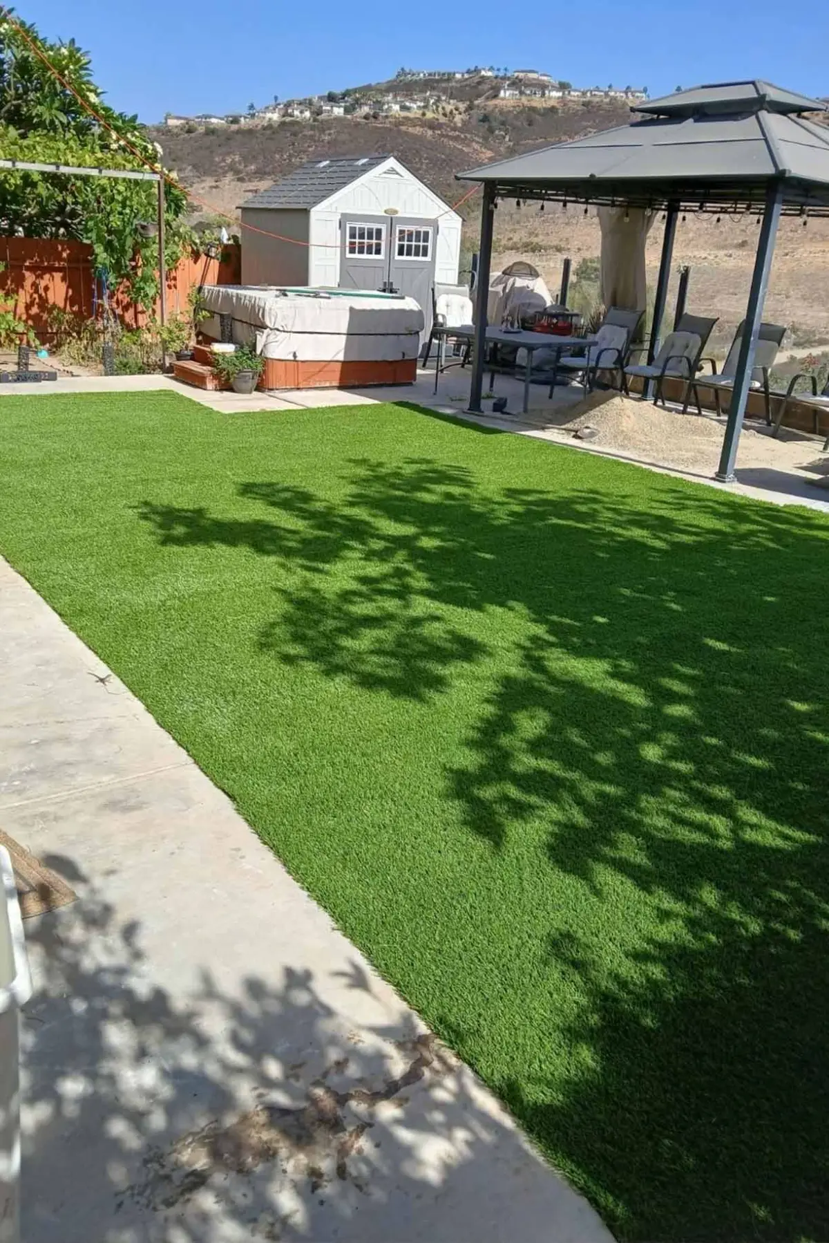 A custom scalloped cedar fence, pet-friendly artificial turf, and large-format paver border walkways transform this Poway backyard into a fully enclosed, low-maintenance outdoor space. Built for pets and privacy, with craftsmanship that shows in every detail.