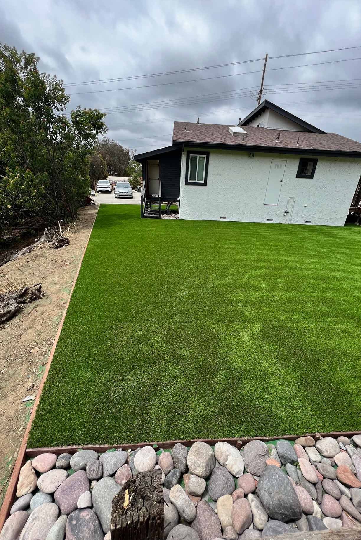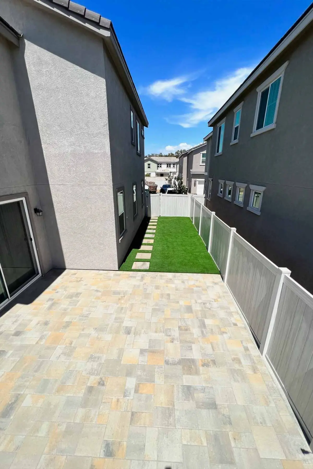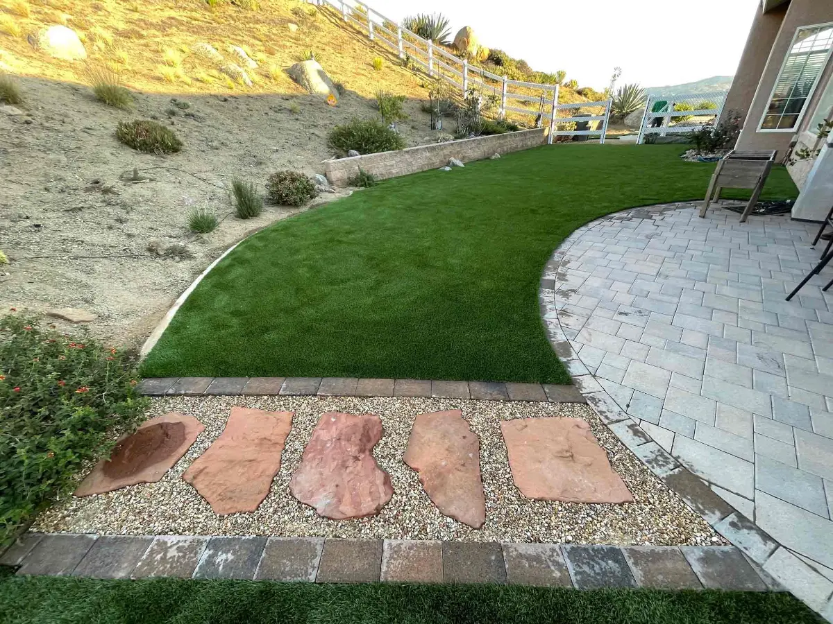 Large-format pavers, premium turf, drainage, and 2x2 stepping stones transform this Valley Center side yard into a clean, functional outdoor space. A white vinyl fence and integrated drainage system deliver a polished, low-maintenance result built to last.