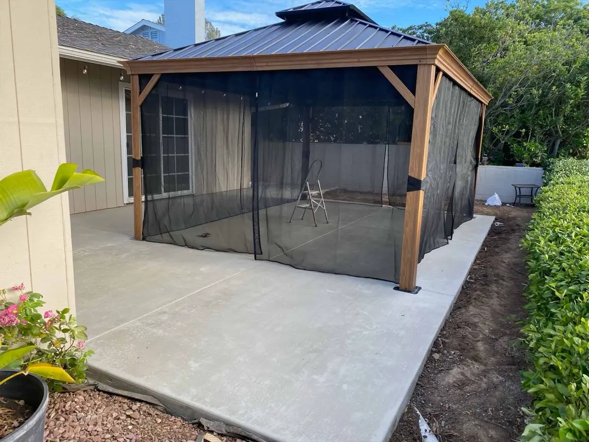 A smooth concrete patio and hardtop pergola with a standing seam metal roof and full mesh screen enclosure turn this Santee backyard into a true outdoor living room. Built for year-round comfort, it's a permanent, weather-ready retreat that's as functional as it is sharp.