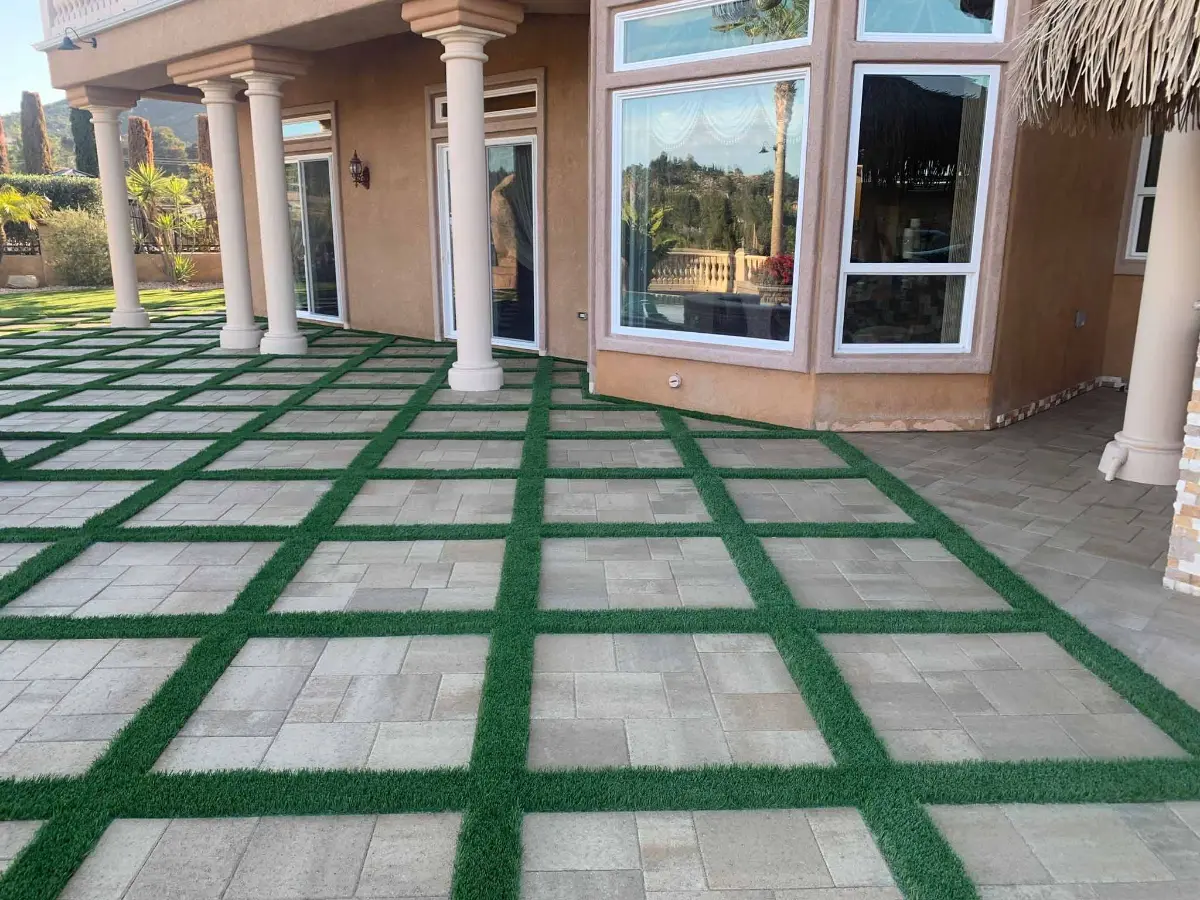Large-format pavers and precision turf grid lines transform this Vista estate's courtyard into a bold, architectural outdoor surface worthy of its Mediterranean surroundings. A seamless drainage system and full-scale grid pattern deliver luxury curb appeal with zero upkeep.