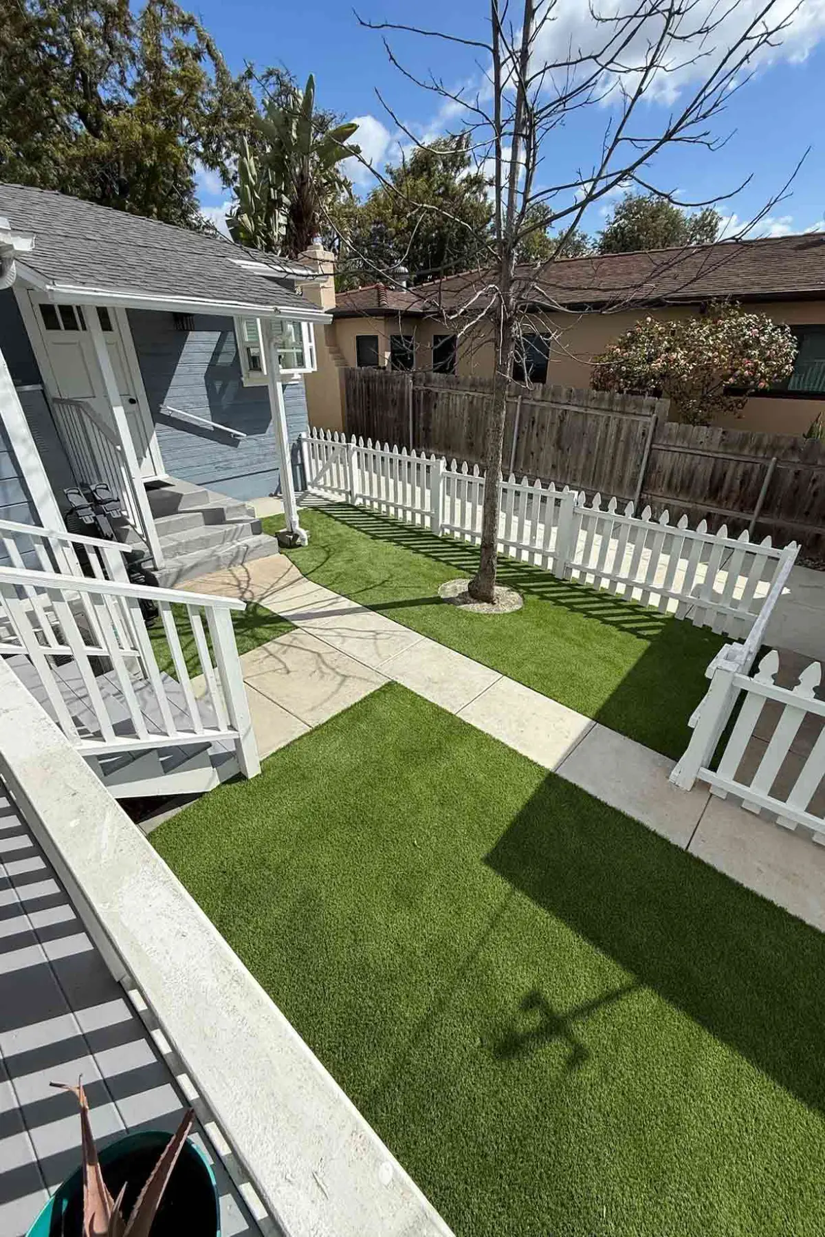 Premium turf, concrete paver edging, a retaining wall, and stepping pad pathways bring structure and warmth to this La Mesa yard, all framed by a classic white picket fence. A clean, low-maintenance transformation that delivers serious curb appeal with a charming, welcoming feel.