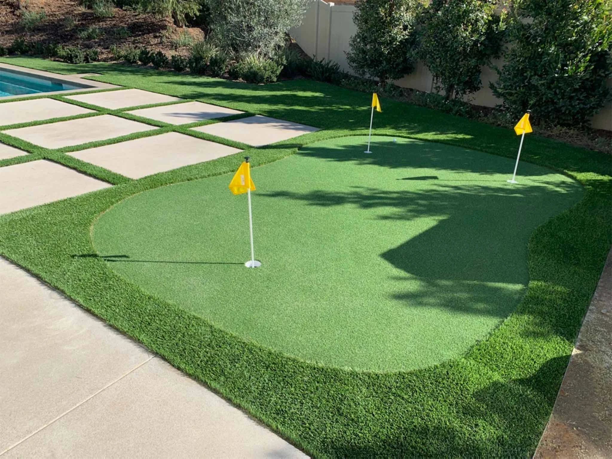 Large-format Top Cast concrete stepping pads in a precision turf grid and a contoured three-hole putting green transform this Del Mar poolside backyard into a resort-style outdoor space. Premium materials, architectural detail, and real golf function — all built alongside the pool.