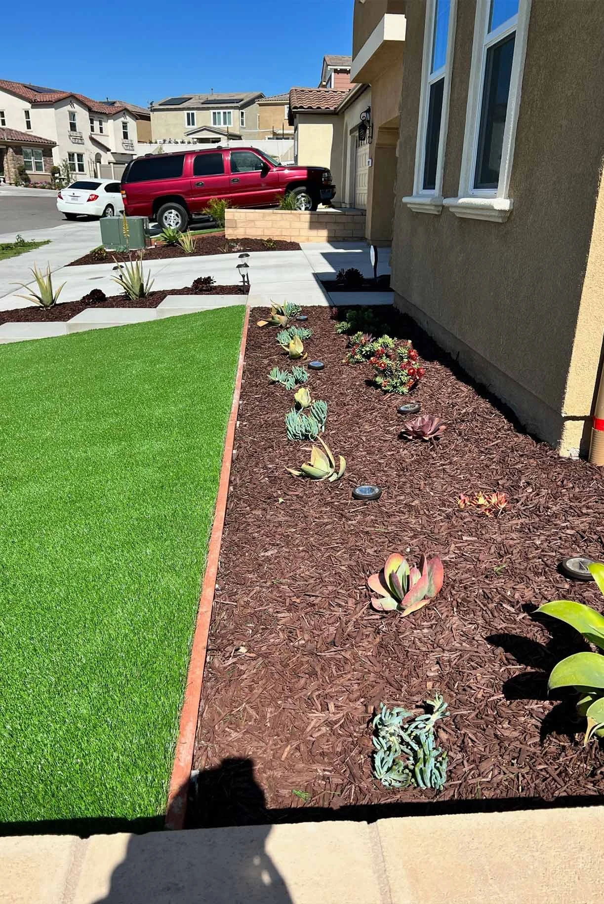 Premium turf, coco brown mulch with drought-tolerant succulents, solar landscape lighting, and a concrete walkway combine to transform this Chula Vista front yard into a low-maintenance, high-curb-appeal exterior. A clean, designed look that holds up beautifully year-round.